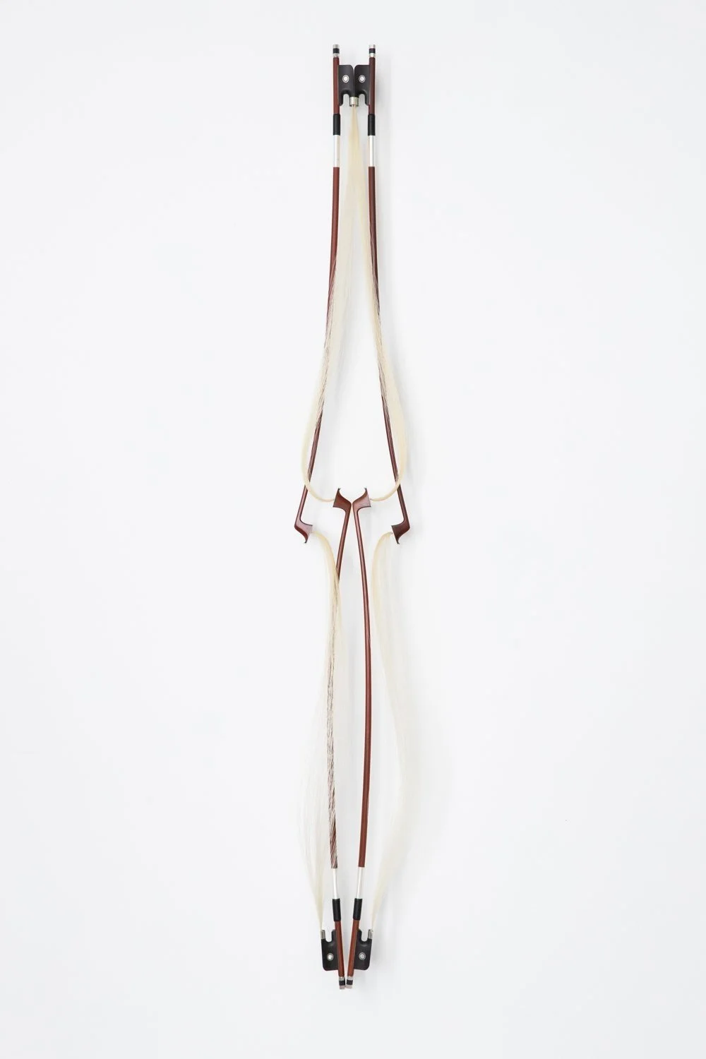 A series of sculptures made from reconfigured, ready-made bows, transforming a centuries-old performative tool. Tsabar uses bows to elicit sound in performances with her ongoing series of Works on Felt. However, in this body of work, the bows are stripped from their functional essence as a tool at the service of sound and are instead turned into a sculptural object in which materials––horsehair and wood, ––become the predominant aesthetic factors. The bow configuration is disrupted as Tsabar diverts the usual flow of the bow hair, from a closed loop on a single bow, to create continuity across two, three or four different bows. The resulting vocabulary of shapes, lines, and forms—potentially endless in configuration—possesses a sensual and bodily presence.